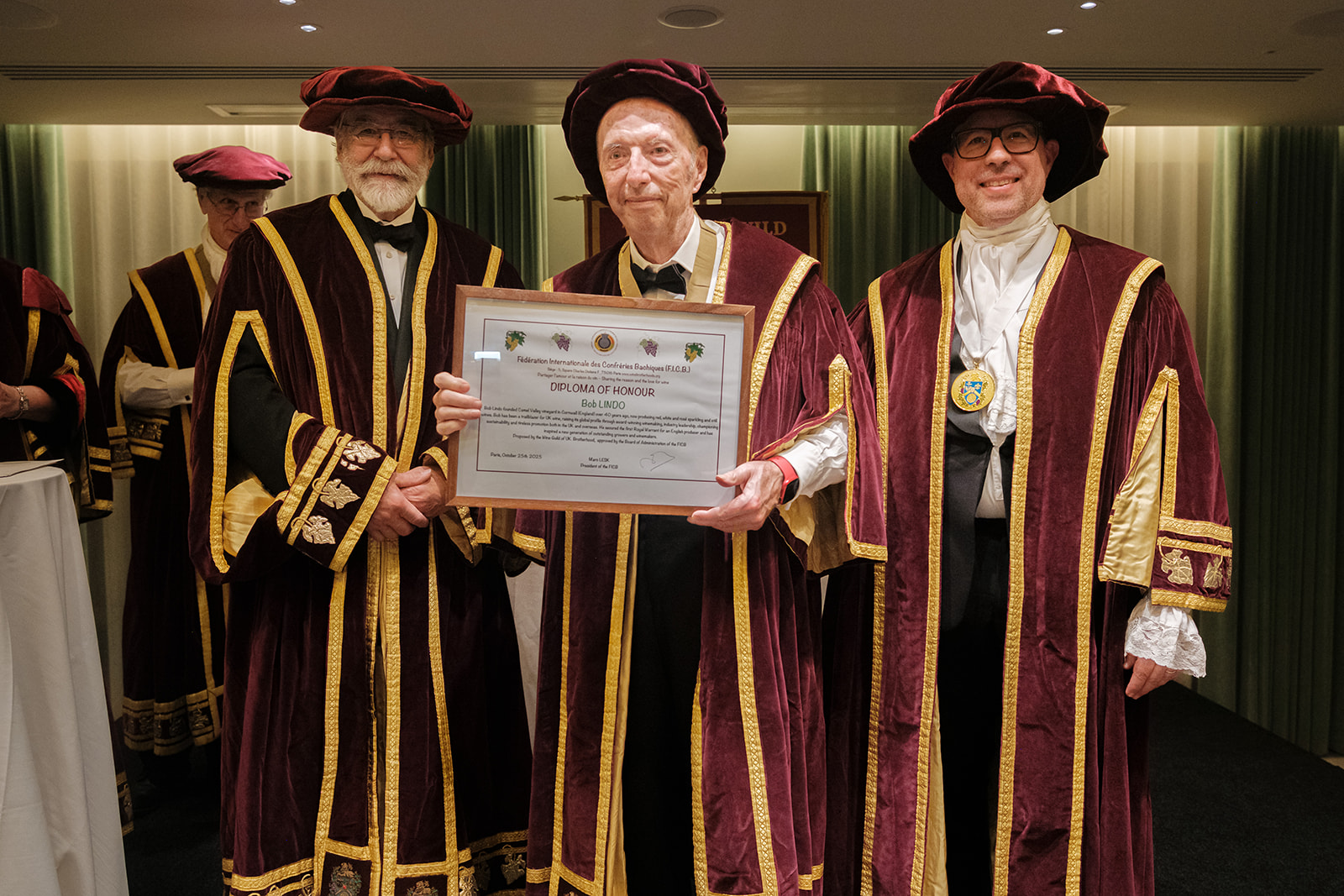 Commenting on his Award, Bob Lindo said: “It really is a tremendous privilege to be awarded the Diploma of Honour from FICB. Given the history and tradition of the wine brotherhoods worldwide, and the reputation of previous recipients. I’m also thrilled that this international award recognises the wine industry in Britain within the wider wine world.