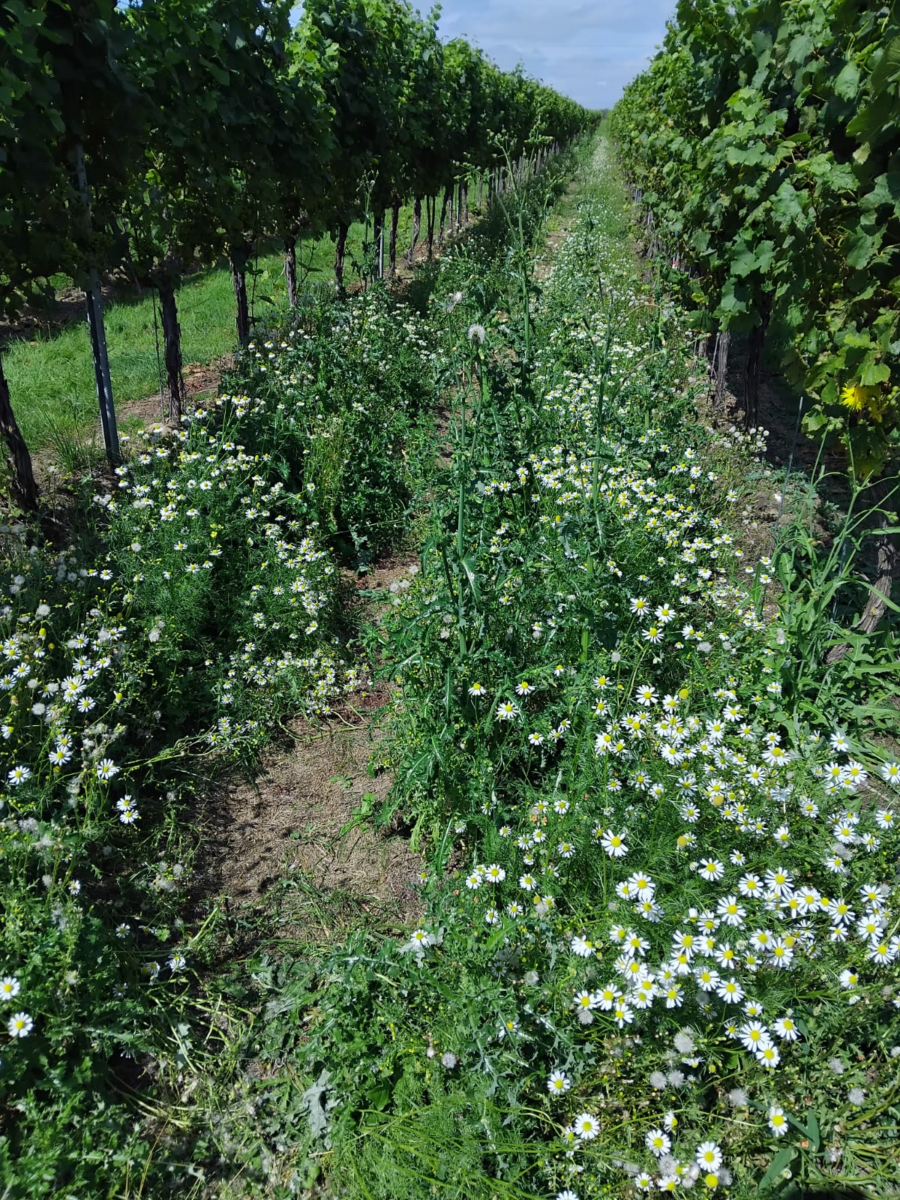Summary: There is a societal demand for environmentally friendly viticultural management practices, that are less reliant on chemical inputs and reduce the carbon footprint of the wine industry. Our study investigated the use of a companion flowering plant (German chamomile/Matricaria chamomilla L.) to deter pests and attract beneficial insects. Chamomile is a fast-growing, insect-pollinated plant with a long flowering period, and volatile-rich (including pest-deterrent component) and is compatible with chitosan. In combination with mushroom-derived low-molecular-weight chitosan (a biopesticide known to be highly compatible with companion flowers), our aim was to generate preliminary data that demonstrates sustainable, practical solutions to reduce disease pressure, increase beneficial insects, decrease pests,and increase soil health in vineyards without negatively impacting grape juice and wine chemistry.